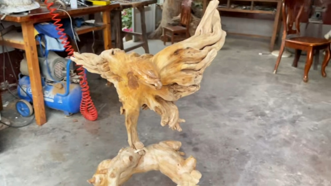 在泰安市泰山区徐家楼街道琵琶湾村的老久木艺工作室,第五代传人刘伟匠心雕琢的根雕《大展宏图》惊艳亮相。作品选材天然老根,遵循“巧藉天然”理念,依循树根“稀、奇、古、怪”的自然形态顺势创作,将人工巧思与自然之美完美融合。上百把刀具轮番上阵,三角刀细刻羽毛纹理,平刀勾勒雄姿轮廓,经半月精雕细琢,雄鹰展翅的造型栩栩如生,寓意新春展翅高飞、前程似锦。